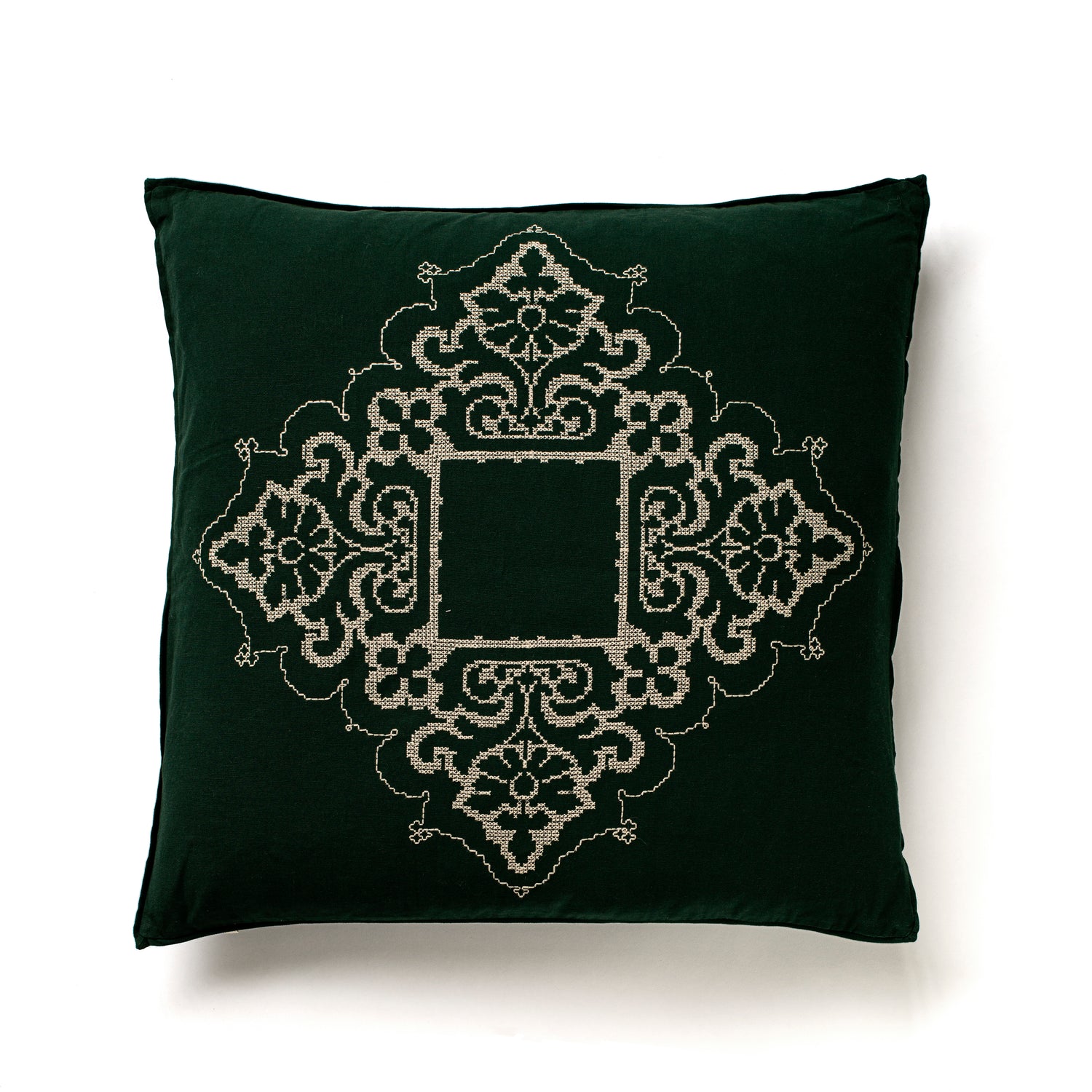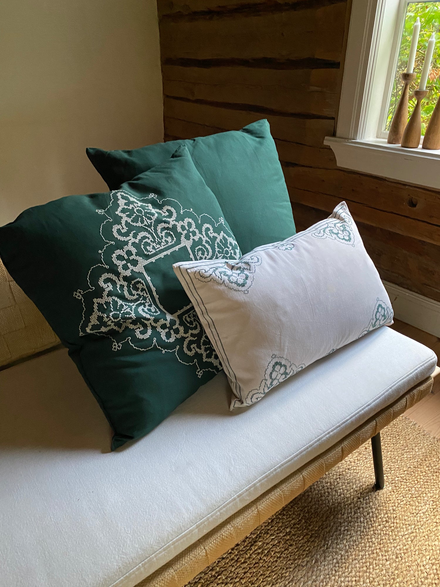 HANNA är vårt stora 65cmx65cm handbroderade kuddfodral här i mörkt grönt kombinerat med handbroderade IRENE 48cmx65cm i grädde med gröna broderier. Det enfärgade mörkgröna kuddfodralet som alternativ heter JOHANNA i måttet 65cmx65cm.