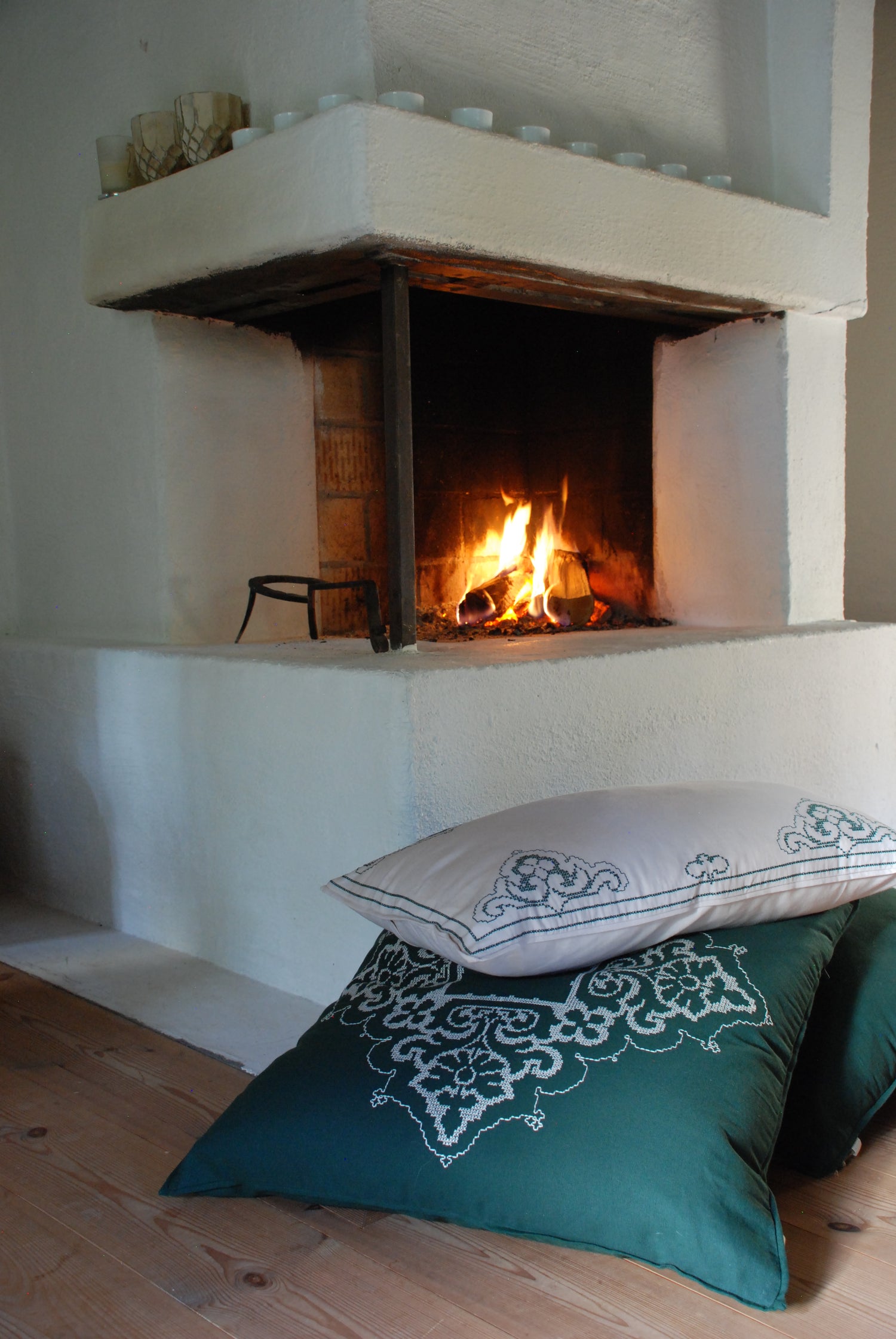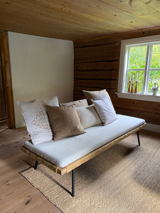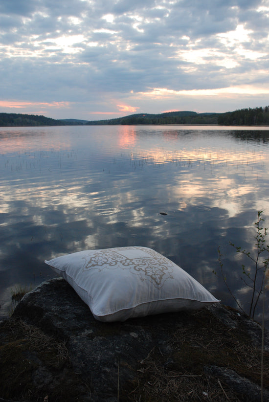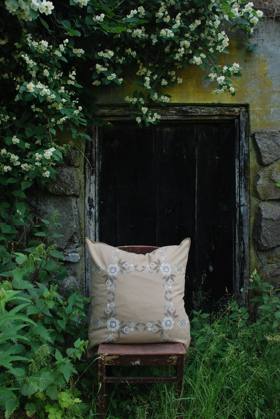 HANNA handbroderad kuddfodralHandbroderade kudden HANNA i handspunnet och handvävt Khadi. Mått 65x65