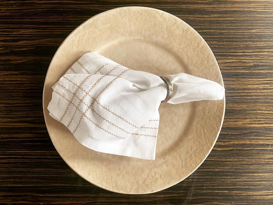 MAY ServettÄggskalsfärgad med zig zag broderat i khaki. Servetten MAY är producerad i vår Khadiväv i bomull/linne. Finns i flera färgkombinationer.